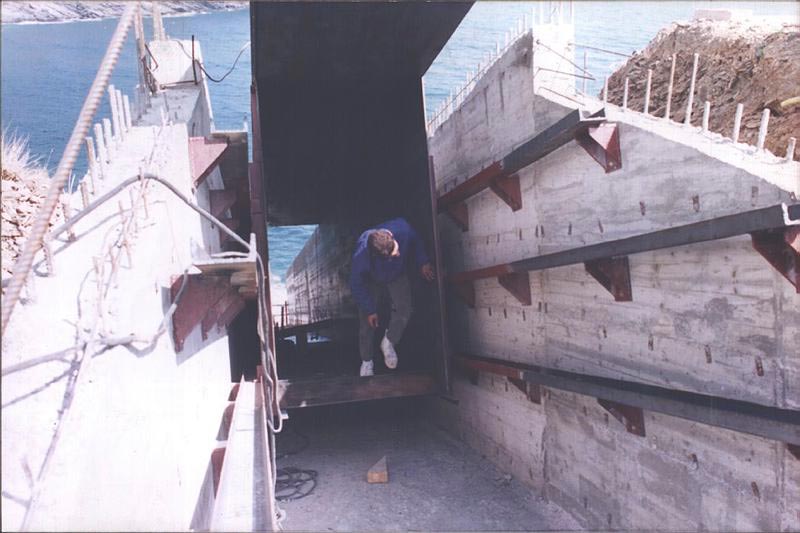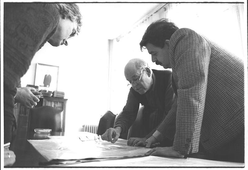 Karavan came to Portbou for the first time in October 1989. He had been commissioned by the publisher Konrad Scheurmann, one of the directors of the Arbeitskreis selbständiger Kultur-Institute (AsKI), acting on behalf of the Federal Republic of Germany’s Ministry of Foreign Affairs. Portbou Town Council offered him its wholehearted assistance, giving him complete freedom to choose the site and the materials. On his second visit to Portbou, in December of that year, Karavan found the location for his project. He sketched in the air, with his characteristically expressive gestures, a first draft of the Memorial. There were many other visits to Portbou (in fact he virtually lived in the town from 1990 to 1992) and many climbs up to the cemetery, guided always by the initial idea, now firmly embraced, which revolved around the whirlpool in the sea. The phenomenon of water , as he has often said, served as a metaphor for the life of the philosopher. Karavan framed with his hands the patch of stormy winter sea containing the vortex and began to give form to his project. Olive tree, stones, path, sea, horizon, fence, cemetery. Karavan saw that the philosopher’s fate could be read in the elemental signs with which the landscape expressed itself. His work would be to make it visible.