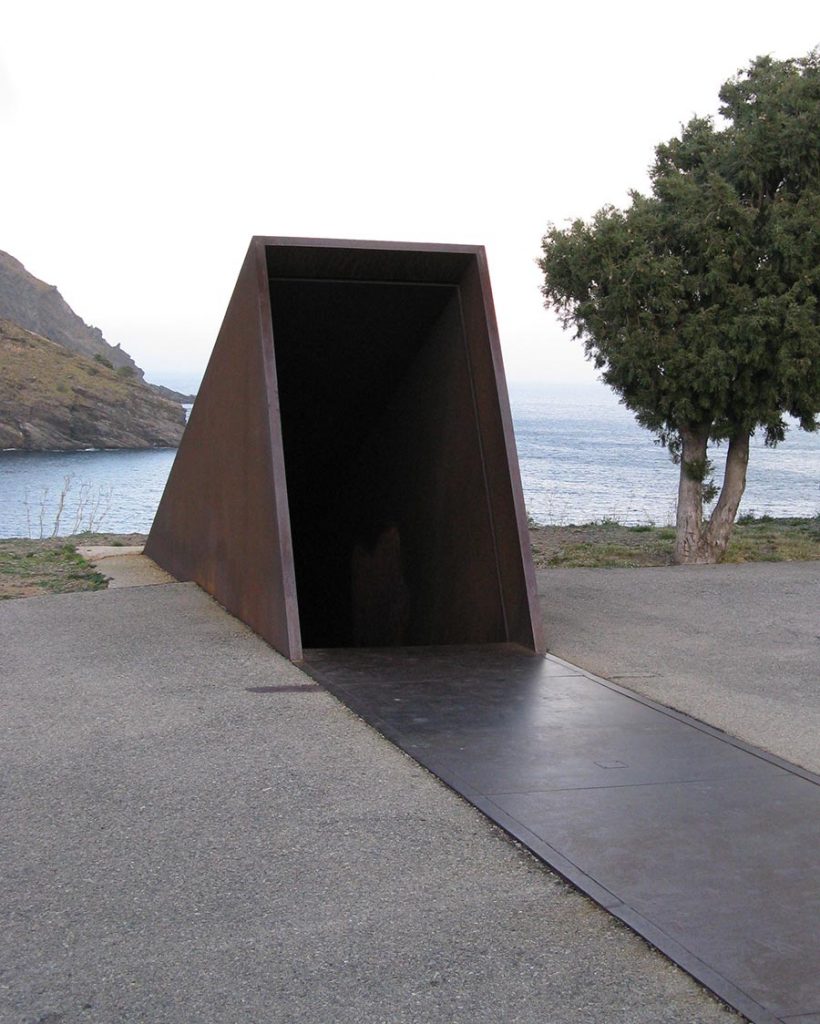 Narrow and rocky, the path leads to a small clearing with a square platform, four metres by four metres, with a stone cube in the centre that invites us to stop. The little esplanade is open to the sea and horizon, but a metal fence stands between us and the horizon — the old cemetery railings. Our journey ends in the cemetery, at the place where Benjamin’s remains lie in a common grave.