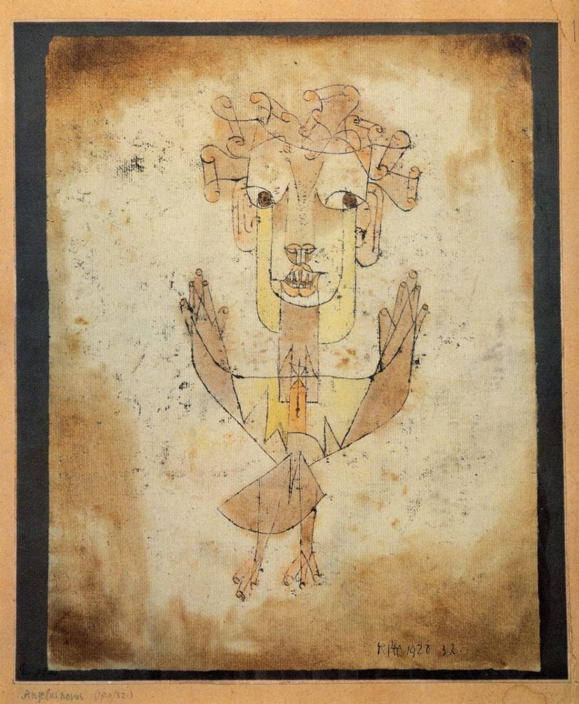 Angelus Novus es una acuarela pintada por Paul Klee en el 1920 que Walter Benjamin adquirió ese mismo año y que adoptó como emblema de su trabajo. En la tradición hebrea, según el Talmud, un ángel nuevo es una criatura creada para cantar un cántico nuevo . Según el cristianismo, según la teología escolástica medieval, un ángel no es un individuo, sinó una especie entera, que en él se extingue.